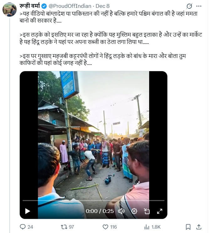 “This video is not from Bangladesh or Pakistan but from our West Bengal, where Mamata Bano’s government is in power… >This boy is being beaten because this is a Muslim-majority area and it is their market. This Hindu boy had set up his vegetable cart here… >Angered by this, the extremist religious people tied the Hindu boy and beat him, saying that you kafirs have no place here…”