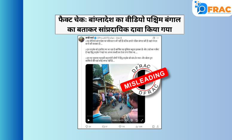 DFRAC’s fact check makes it clear that the video of the youth being beaten is from Comilla, Bangladesh, where a youth was beaten on allegations of theft in a mosque. It is being falsely and communally claimed that it shows a Hindu youth being beaten by Muslims in West Bengal.