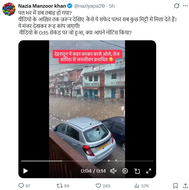 A video was shared on social media, which shows a devastating rainfall, along with hailstones, falling on cars parked on the road, due to which houses and cars have been badly damaged. The user who shared this video has described it as Dehradun. The text is written on the video is, “in Dehradun, the pellets rained down, causing devastation. Daily life was affected due to the heavy rain.”