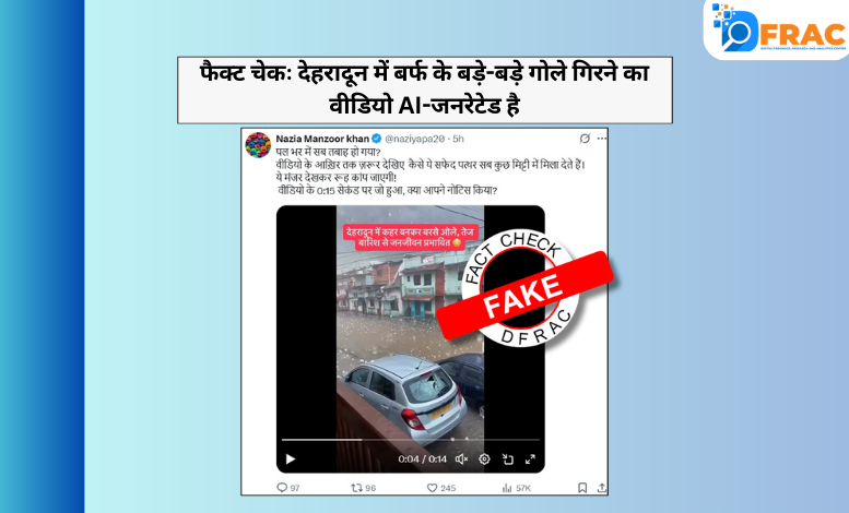 From the fact check of DFRAC, it is clear that the video shared on social media is AI-generated. No incident like large balls of ice falling has happened in Dehradun. Therefore, the user’s claim is fake.