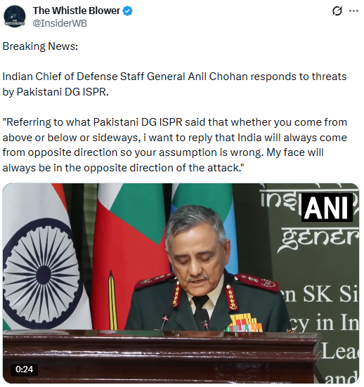 The account, under the username @InsiderWB on X, posted the video with a caption stating: “Breaking News: Indian Chief of Defense Staff General Anil Chauhan responds to threats by Pakistani DG ISPR.” It also quoted an alleged statement from General Chauhan: “Referring to what the Pakistani DG ISPR said about whether you come from above, below, or sideways, I want to reply that India will always come from the opposite direction, so your assumption is wrong. My face will always be in the opposite direction of the attack.”