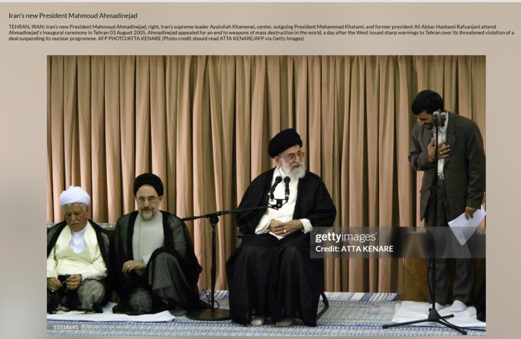 We conducted a Google reverse image search on each individual separately. We found the image on the Getty Images Platform. The original photograph of Khamenei is from the inauguration ceremony for former Iranian President Mahmoud Ahmadinejad, held on August 3, 2005, in Tehran, Iran’s capital city. It was captured by AFP, photographer Atta Kenare, and shows Khamenei looking toward Ahmadinejad while former Iranian presidents, Mohammad Khatami and Ali Akbar Hashami Rafsanjani, are seen sitting next to Khamenei.