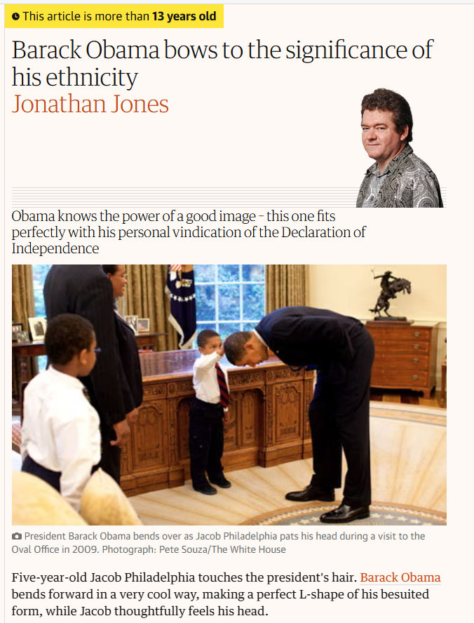 Also, the image of Obama bowing has been taken from an official White House photograph, from May 8, 2009. It shows Obama in the Oval Office bending to allow a White House staff member’s 5-year-old son, Jacob Philadelphia, to touch his hair to see if the president’s hair felt like his own.