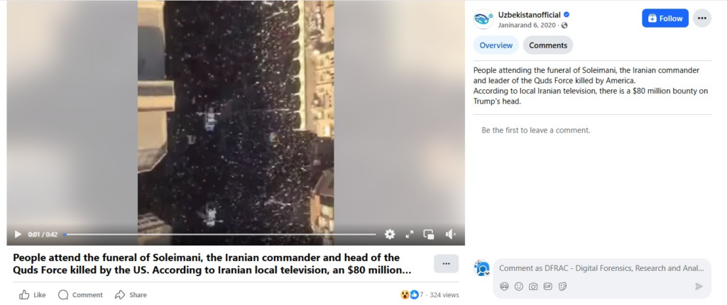 During the DFRAC team’s research, we found that the video going viral on social media is being shared with a misleading claim. We conducted a reverse image search and found this video on a Facebook account with the username Uzbekistanofficial, where it was mentioned that “People attending the funeral of Soleimani, the Iranian commander and leader of the Quds Force, killed by America.”