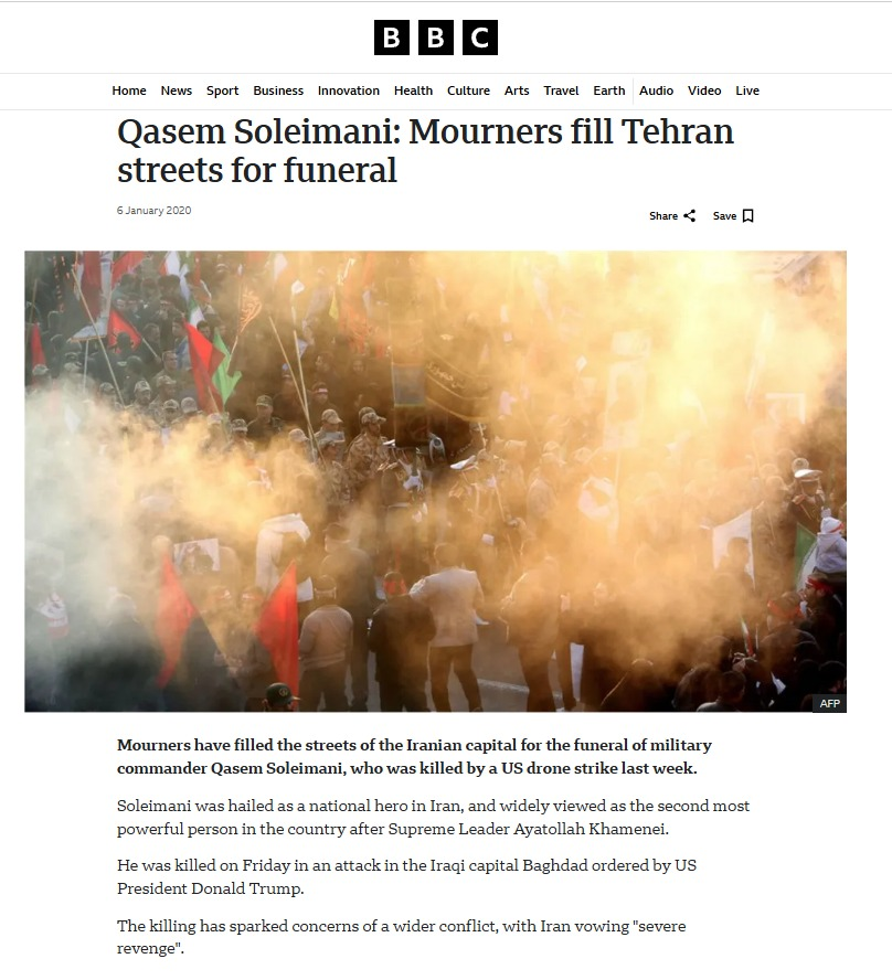 Information about this video was also found on a BBC article, which reported that a large number of people had taken to the streets of Iran’s capital, Tehran, to mourn during the funeral of the Chief of the Quds Force, Islamic Revolutionary Guard Corps (IRGC) Qasem Soleimani. In Iran, Qasem Soleimani was regarded as a national hero and was widely considered the second most powerful figure in the country after Supreme Leader Ayatollah Khamenei. Qasem Soleimani was killed on 20 January 2020 in a U.S. attack in Iraq.