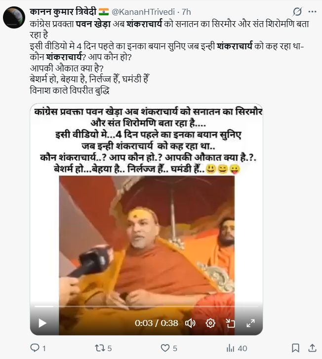 Edited video of Pawan Khera criticising Shankaracharya Avimukteshwaranand as shameless and arrogant