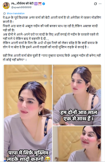 “This is Aarti Sharma, daughter of former BJP MLA Anant Sharma, who lives in America and works as a model. For the past eight years, she has been living with Abdul Nadeem as his wife, but they have not married yet. Now, when both approached their families regarding marriage, Nadeem’s family initially refused but later agreed. However, Aarti Sharma’s father is still doubtful about this relationship, fearing that society may say he got his daughter married to a Muslim man. Meanwhile, Miss Aarti Sharma has clearly stated, ‘Papa, your son-in-law will be only Abdul Nadeem, otherwise no one.’”