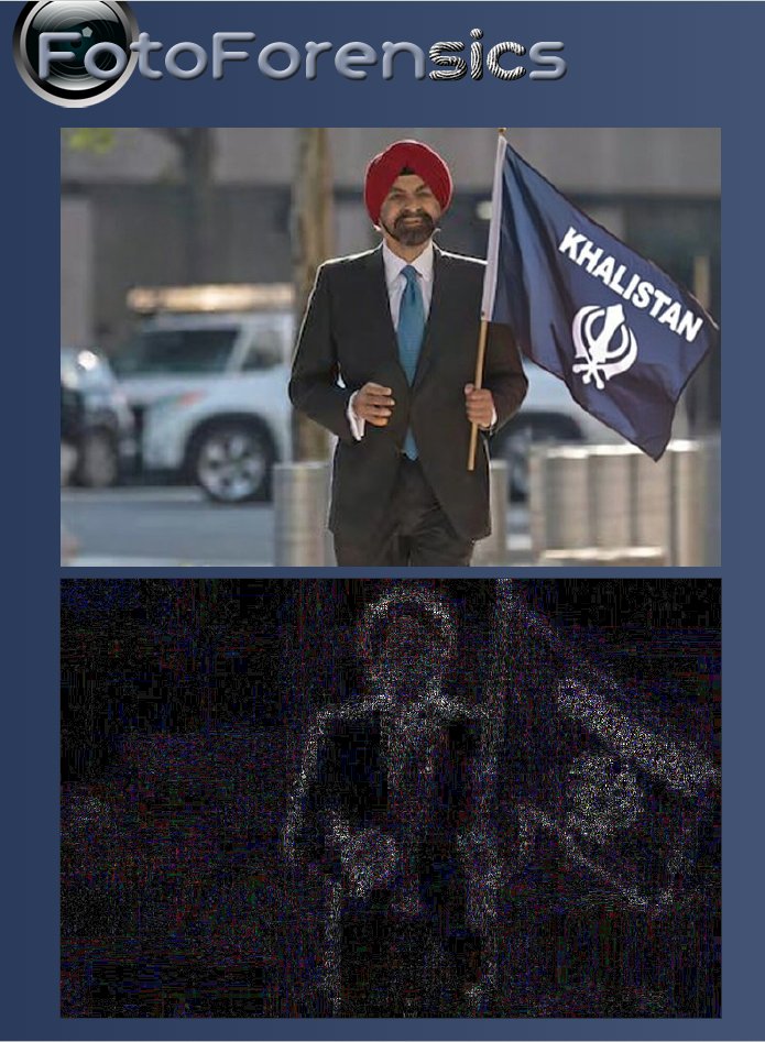Further analysis using FotoForensics revealed clear signs of digital manipulation, including the addition of the Khalistan flag and the removal of the coffee cup from his hand.