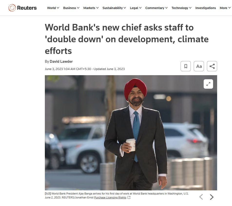 Upon investigation, we found the claim to be fake. A reverse image search traced the original photograph to Reuters, which shows Ajay Banga arriving for his first day at the World Bank headquarters in Washington, U.S., on June 2, 2023 (Photo: Reuters/Jonathan Ernst). The original image shows him holding a coffee cup, not a flag.