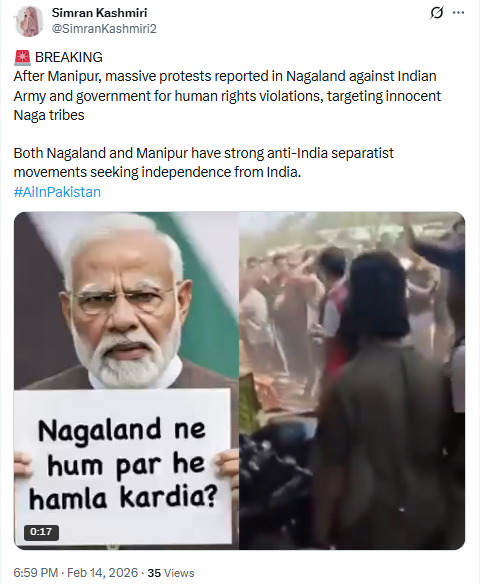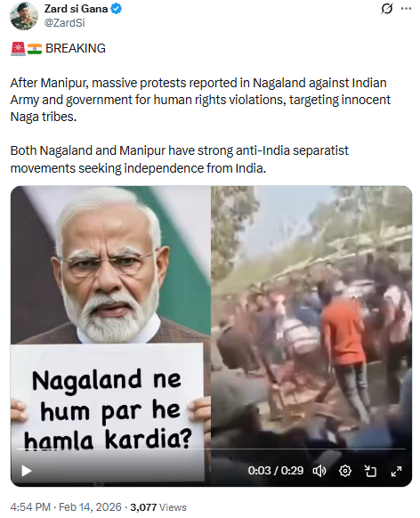 On social media platform X, a verified Pakistani user shared the viral video claiming that after Manipur, there are reports of massive protests in Nagaland against the Indian Army and the government, alleging that innocent Naga tribes are being targeted and subjected to human rights violations. The post further claims that strong anti-India separatist movements demanding independence are active in both Nagaland and Manipur.