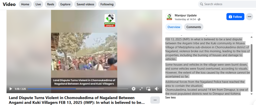 Further investigation led us to a news report uploaded on YouTube by the news channel North East Live on 13 February 2026. This report also included visuals from the viral video. According to the report, clashes erupted between residents of two villages over a land dispute in Moawa village, located on the outskirts of Dimapur in Nagaland. During the incident, several houses were set on fire and multiple vehicles were damaged. The incident took place in the Medziphema sub-division of Chümoukedima district and involved the Chakroma Public Organization and residents of Moawa village.