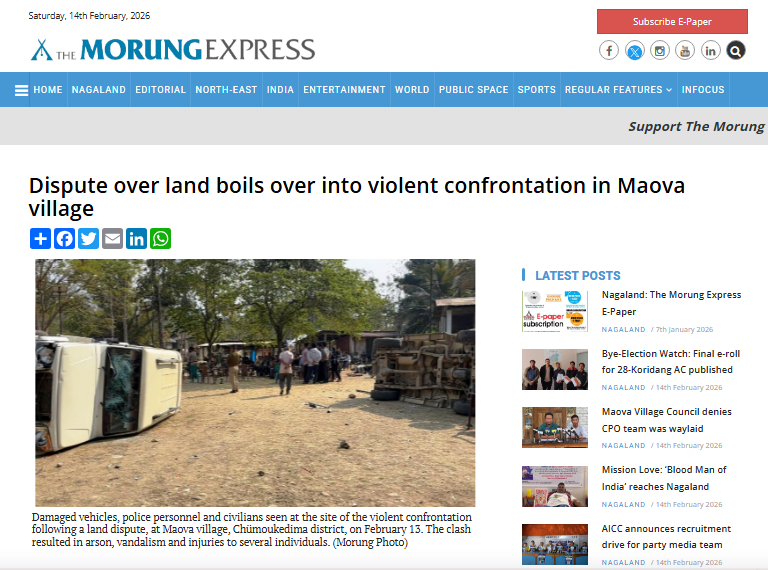 Additionally, we found a report by the newspaper The Morung Express, which also confirmed the violent clash that occurred in Moawa village on 13 February 2026 due to a land dispute. Nowhere in the report was there any mention of large-scale protests against the Indian Army or demands for independence from India.