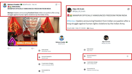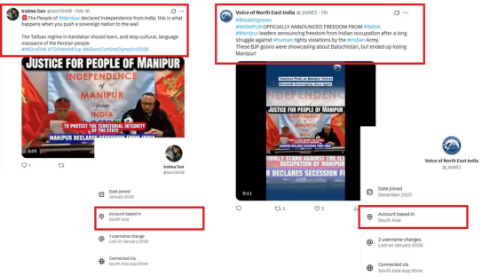 Accounts Samaira Rind and Mehr Gadh, both geolocated to Pakistan, shared an identical video with near-identical text falsely claiming that Manipur had officially declared independence from India. The wording wasn’t similar, it was copied. The video, framing, and even sentence structure were replicated across both posts. Strat-Front and Rational Dialogue, also Pakistan-based, either posted original disinformation or boosted existing content through reposts and likes, quietly inflating reach without creating original material.