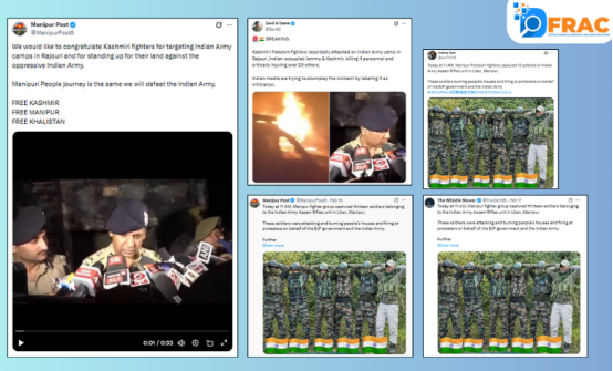 Five X (formerly Twitter) handles emerged as central players in this campaign: ManipurPost5, ZardSiGana, InsiderWB, Ireima Sen, and Kussikhuelafn. Each account consistently frames Manipur events through an anti-India lens. Visual sources are rarely disclosed. Claims go unverified. Local incidents are presented as evidence of systemic state failure or organized armed resistance.