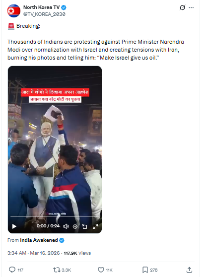 While sharing the video, a user named “North Korea TV” wrote in a post: *“Breaking: Thousands of Indians are protesting against Prime Minister Narendra Modi over normalization with Israel and creating tensions with Iran, burning his photos and telling him: ‘Make Israel give us oil.”