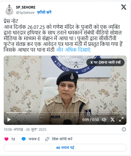 We also found a statement on this incident from police officer Abhinandana Sharma, posted on the official X handle of the Sehore police on July 26, 2025. In her statement, the police officer stated that the accused in the complaint filed by the priest is named Mahesh Yadav. The police wrote in the post, ‘Press Note: Today, on 26.07.25, a video of a person threatening the priest of the Ganesh temple with a sharp weapon came to light through social media. The priest has submitted an application, along with CCTV footage, to the Mandi police station, based on which the Mandi police registered a case under relevant sections and arrested the accused. The Mandi police station is conducting further investigation in the case.’