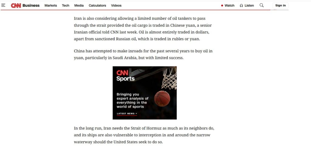 Upon further investigation, we found a report by CNN News stating, ‘Iran is also considering allowing a limited number of oil tankers to pass through the strait provided the oil cargo is traded in Chinese yuan, a senior Iranian official told CNN last week’.