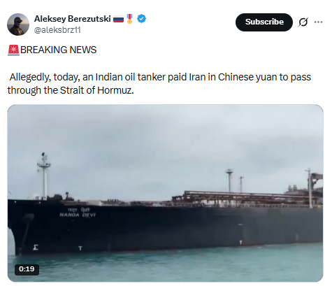 A user on X wrote a post, ‘BREAKING NEWS Allegedly, today, an Indian oil tanker paid Iran in Chinese yuan to pass through the Strait of Hormuz.’