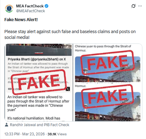 In our further investigation, we found a post by India’s MEA Fact Check Unit. In that post, it was clarified that the viral posts claiming an Indian oil tanker paid Iran in Chinese yuan to pass through the Strait of Hormuz are fake.