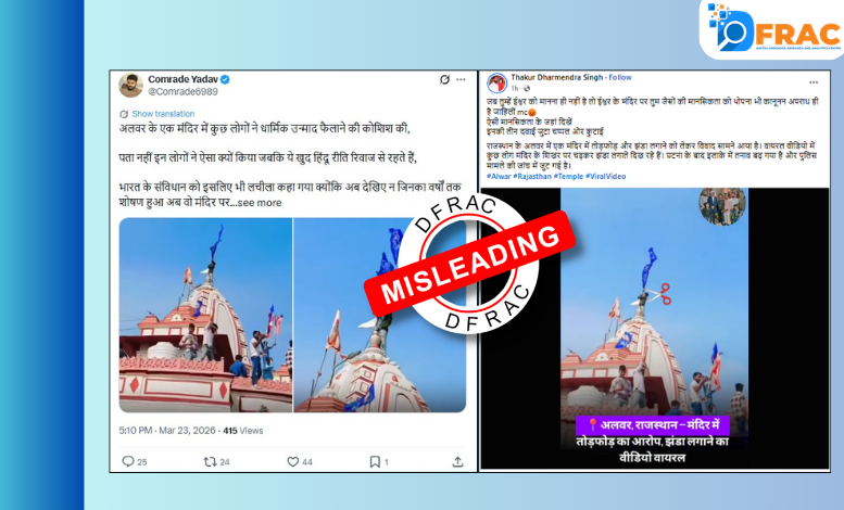 DFRAC’s fact check clearly shows that there has been no recent incident of a blue flag being hoisted on a temple in Alwar. According to the police, this video is of a two-year-old incident, hence the users’ claim is misleading.