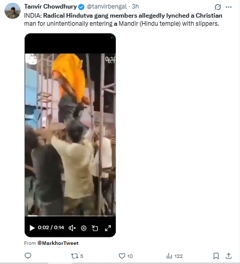 One user shared the video with a caption that “Radical Hindutva gang members allegedly lynched a Christian man for unintentionally entering a Mandir (Hindu temple) with slippers.”