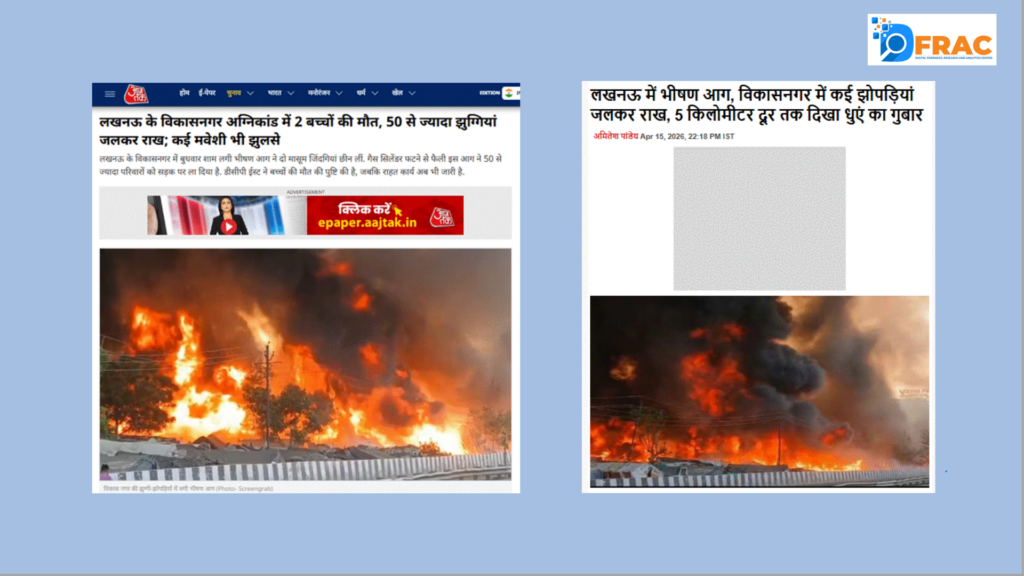 To investigate the viral claim, DFRAC extracted keyframes from the video and conducted a reverse image search. During the investigation, the same video was found in a report by Dainik Bhaskar. According to the report, the incident took place in the Vikas Nagar area of Lucknow, where a massive fire broke out on Wednesday at around 5:30 PM.