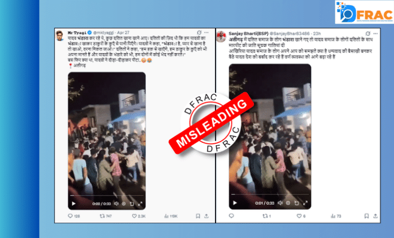 DFRAC’s fact check clarifies that the viral video depicts a physical altercation during a wedding ceremony in Mohreni village, located in the Iglas area of Aligarh. The footage is being shared with the misleading claim that Dalits were beaten at a bhandara organized by the Yadav community.