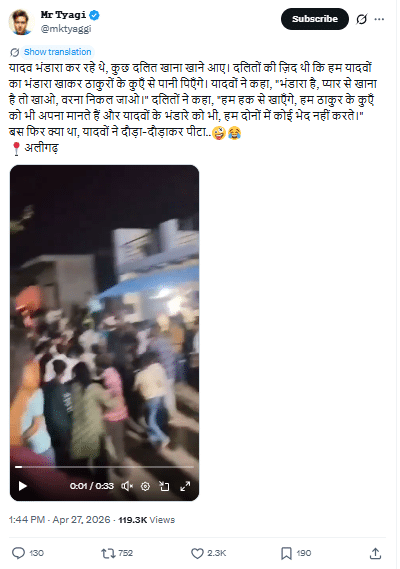 Sharing the video, a user named Mr. Tyagi wrote: Yadavs were organizing a bhandara, and some Dalits came to eat. The Dalits insisted that they would eat at the Yadavs’ bhandara and then drink water from the Thakurs’ well. The Yadavs said, ‘It is a bhandara; if you want to eat peacefully, then eat, otherwise leave.’ The Dalits replied, ‘We will eat as a matter of right; we consider the Thakurs’ well and the Yadavs’ bhandara as ours, and we make no distinction between the two.’ That was it—the Yadavs chased and beat them… Aligarh. (English Translation)