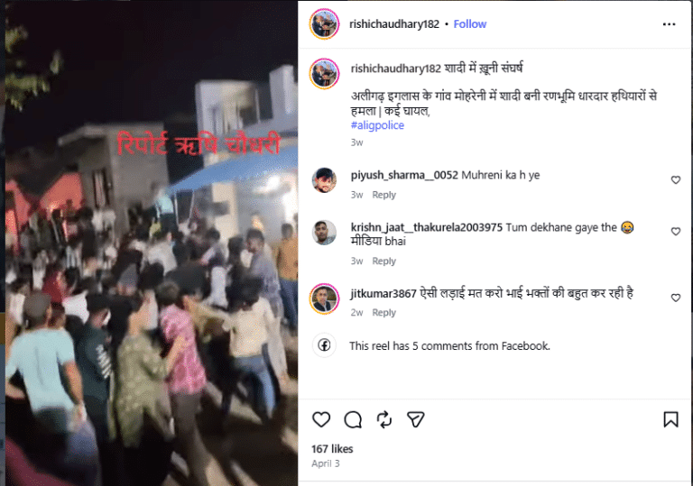The DFRAC team found during its investigation that the claim being made with the viral video is misleading. The video actually shows a clash during a wedding ceremony in Mohreni village in the Iglas area of Aligarh. It was posted on several social media platforms on April 3. A local journalist from Aligarh, Rishi Chaudhary, shared the video, stating: “Violent clash at a wedding. A wedding turned into a battlefield in Mohreni village, Iglas, Aligarh; attack with sharp-edged weapons; many injured, #aligarhpolice.”(English Translation)