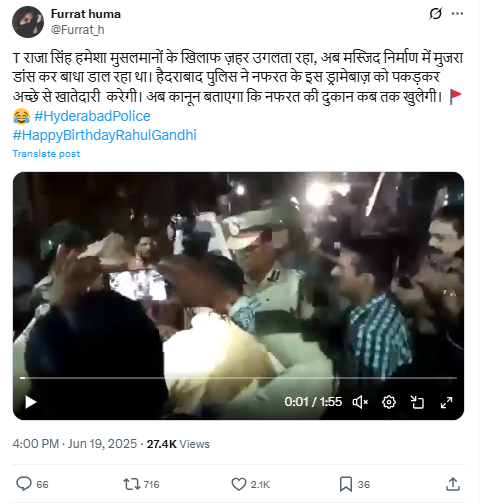 इसके अलावा Furrat huma नामक यूजर ने लिखा, ‘T राजा सिंह हमेशा मुसलमानों के खिलाफ ज़हर उगलता रहा, अब मस्जिद निर्माण में मुजरा डांस कर बाधा डाल रहा था। हैदराबाद पुलिस ने नफरत के इस ड्रामेबाज़ को पकड़कर अच्छे से खातेदारी करेगी। अब कानून बताएगा कि नफरत की दुकान कब तक खुलेगी।‘