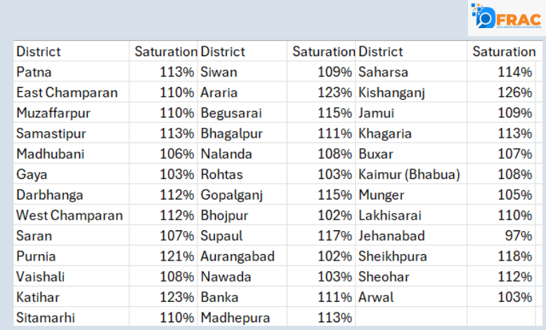 DFRAC की टीम ने आधिकारिक वेबसाइट https://uidai.gov.in/ पर आधार सेचुरेशन का डाटा देखा। हमारी टीम ने सबसे पहले इन चार जिलों किशनगंज, पूर्णिया, कटिहार और अररिया का डाटा देखा। हमने पाया कि जो आंकड़े दिए गए हैं, वो बिल्कुल सही है। लेकिन यहां पर एक प्रश्न और खड़ा होता है कि क्या सिर्फ इन्हीं जिलों में आधार सेचुरेशन 100 प्रतिशत से ज्यादा है या फिर बाकी जिलों में आधार सेचुरेशन ज्यादा है। हमने पाया कि बिहार के सिर्फ जहानाबाद (97 प्रतिशत) को छोड़कर लगभग सभी जिलों में आधार का सेचुरेशन 100 प्रतिशत से ज्यादा है। हम यहां बिहार के कुल 38 जिलों के आधार सेचुरेशन का डाटा दे रहे हैं।