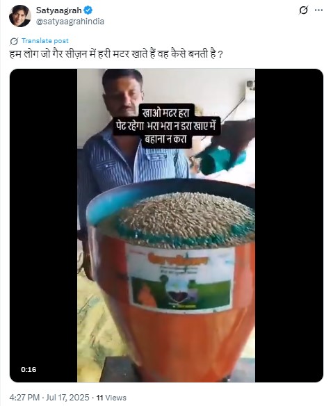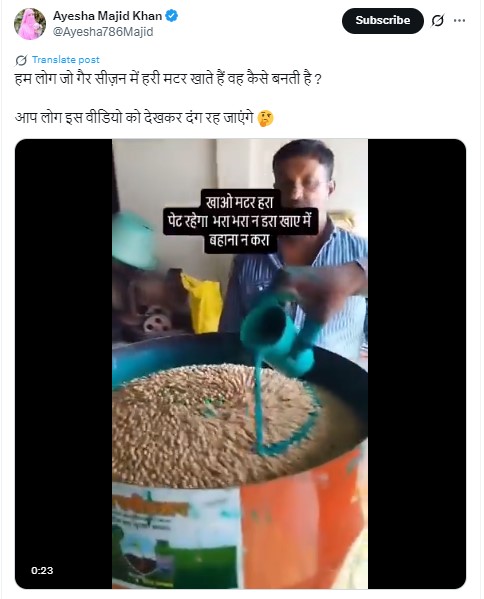 सोशल साईट X पर वेरिफाईड यूजर आयशा मजीद खान ने वायरल वीडियो को शेयर करते हुए लिखा कि हम लोग जो गैर सीज़न में हरी मटर खाते हैं वह कैसे बनती है ? आप लोग इस वीडियो को देखकर दंग रह जाएंगे 🤔