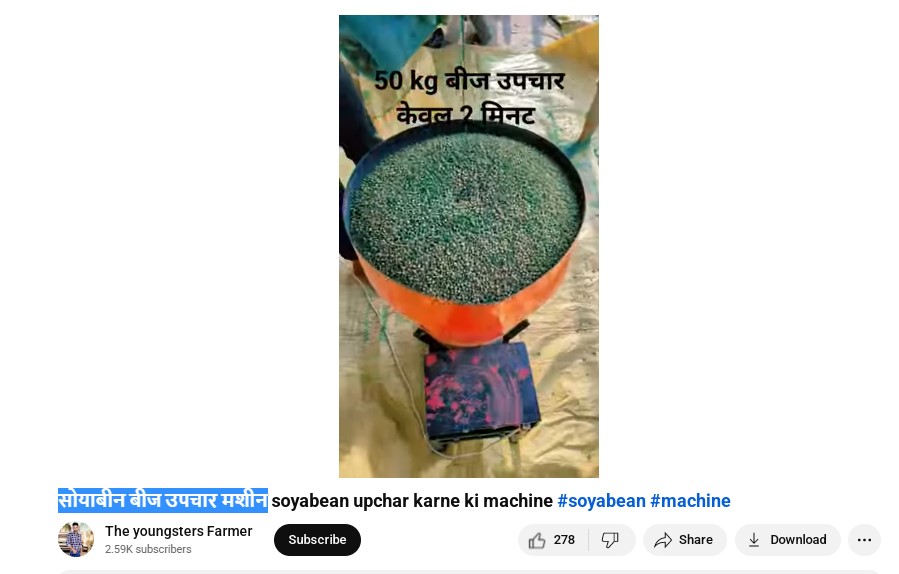 वायरल वीडियो के साथ किये गए दावे की जांच के लिए DFRAC ने सबसे पहले वायरल वीडियो को कीफ्रेम में कन्वर्ट किया। उसके बाद कीफ्रेम को रिवर्स सर्च किया। इस दौरान हमें ऐसा ही एक वीडियो यूट्यूब पर मिला। वीडियो को केप्शन देते हुए बताया गया कि सोयाबीन बीज उपचार मशीन यानि वायरल वीडियो में दिखाई दे रही मशीन सोयाबीन के उपचार की मशीन है।