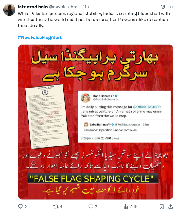 पाकिस्तानी सोशल मीडिया पर भारतीय खुफिया एजेंसी RAW का एक फर्जी सीक्रेट डॉक्यूमेंट शेयर किया जा रहा है। इस फेक सीक्रेट डॉक्यूमेंट के साथ पाकिस्तानी यूजर्स दावा कर रहे हैं कि ‘रॉ के गुप्त नेटवर्क से मिली जानकारी और डार्क वेब पर लीक हुए दस्तावेज़ इस बात की पुष्टि करते हैं कि अमरनाथ यात्रा पर हमले की योजना भारत के अंदर ही बनाई जा रही है। यह हमला दरअसल दुनिया की आँखों में धूल झोंककर पाकिस्तान को बदनाम करने के इरादे से रचा गया एक नाटक होगा।’ हालांकि यह दावा फेक है।