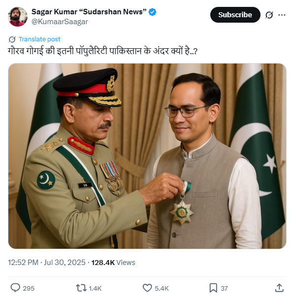 सुदर्शन न्यूज के पत्रकार कुमार सागर ने फोटो शेयर करते हुए लिखा, ‘गौरव गोगई की इतनी पॉपुलैरिटी पाकिस्तान के अंदर क्यों है..?’