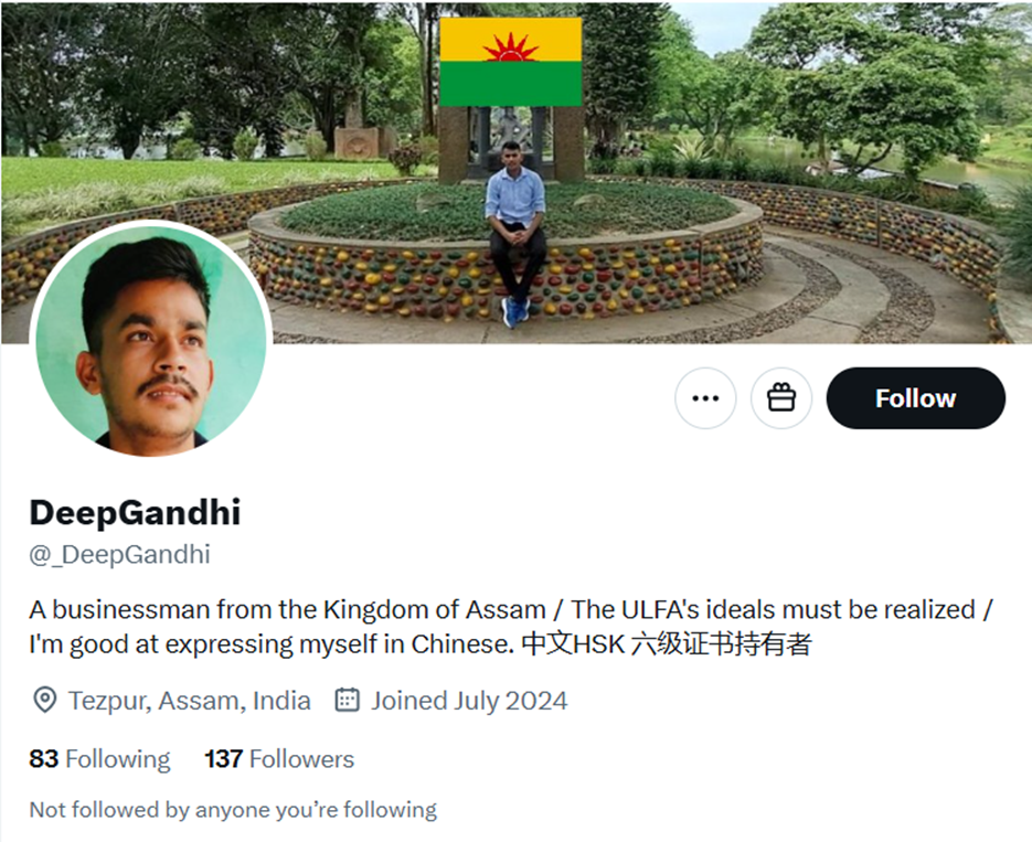 दीप गांधी ने खुद की पहचान को असम राज्य के रहने वाले नागरिक के रुप बताया है। उसने अपने लोकेशन में तेजपुर, असम, इंडिया लिख रखा है। लेकिन उसके बायो को देखने पर उसके अलगाववादी सोच का पता चलता है। उसने बायो में लिखा है, ‘असम किंगडम का एक व्यापारी / उल्फा के आदर्शों को साकार किया जाना चाहिए / मैं चीनी भाषा में अपनी बात कहने में अच्छा हूँ।’ (हिन्दी अनुवाद)