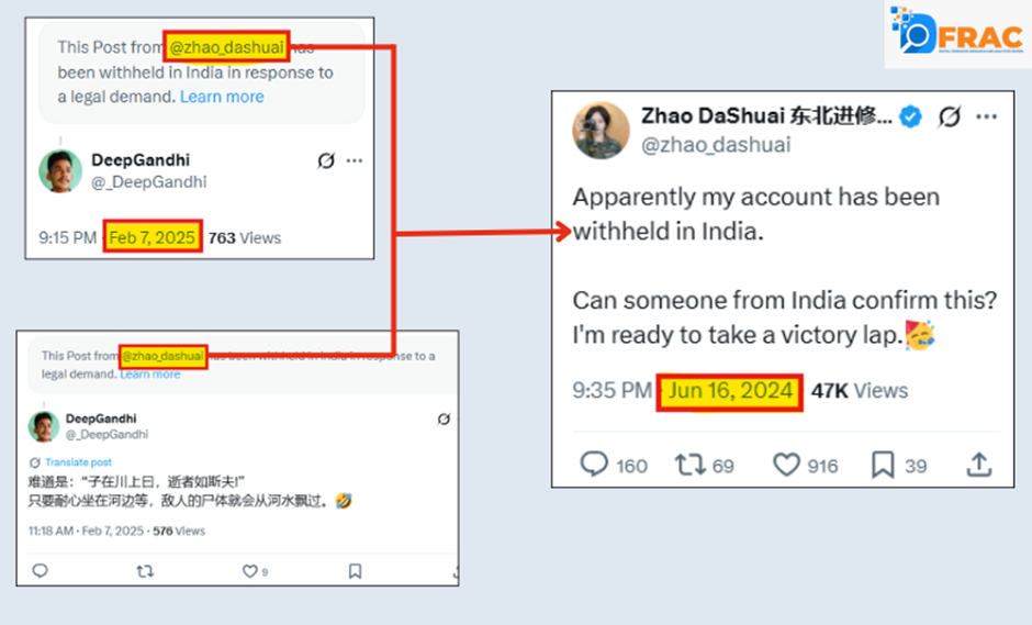 उदाहरण के तौर पर एक चाइनीज प्रोपेगेंडा अकाउंट झाओ दाशुआई है, जिसे भारत में विथहेल्ड कर दिया गया है। झाओ ने 16 जून 2024 को एक पोस्ट में बताया था कि उसका अकाउंट भारत में विथहेल्ड कर दिया गया है, जबकि उसके एक महीने बाद जुलाई के महीने में दीप गांधी का एक्स अकाउंट बनाया गया है। दीप गांधी ना सिर्फ झाओ दाशुआई को फॉलो करता है, बल्कि उसके पोस्ट पर इंप्रेशन जनरेट करने के लिए लाइक, कमेंट और रिपोस्ट करता है। नीचे दिए गए ग्राफिक्स में आप देख सकते हैं कि भारत में विथहेल्ड झाओ दाशुआई के अकाउंट पर दीप गांधी ने कमेंट किया है।