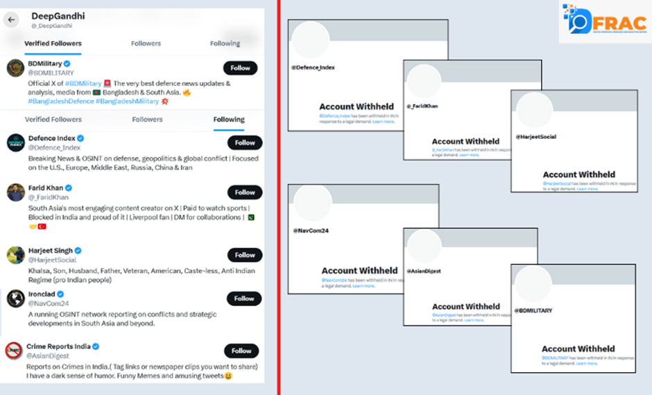 भारत में पाकिस्तान, चाइनीज और खालिस्तानी प्रोपेगेंडा करने वाले कई अकाउंट्स को विथहेल्ड कर दिया गया है। इन अकाउंट्स में डिफेंस इंडेक्स (Defence Index), फरीद खान (Farid Khan), हरजीत सिंह (Harjeet Singh), आयरल क्लैड (Ironclad), क्राइम रिपोर्ट्स इन इंडिया (Asian Digest) और बीडी मिलिट्री (BD Military) शामिल हैं। ये भारत में प्रतिबंधित अकाउंट्स और दीप गांधी एक-दूसरे को फॉलो करते हैं और पोस्ट को शेयर करते हैं।