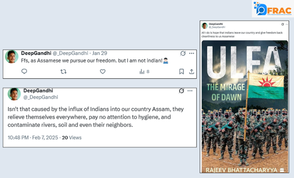 जब दीप गांधी जैसे अकाउंट इस नाम का इस्तेमाल करते हैं, तो यह सिर्फ शब्द चयन नहीं होता, बल्कि सीधे-सीधे चीन की भाषा और दावे को आगे बढ़ाने जैसा होता है। यह एक सोची-समझी रणनीति का हिस्सा लगता है, क्योंकि बार-बार इस्तेमाल करने से यह शब्द धीरे-धीरे सामान्य चर्चा में जगह बनाने लगता है, और यही किसी भी प्रोपेगेंडा का मकसद होता है। इसके अलावा, दीप गांधी असम के संदर्भ में भी वही पैटर्न अपनाता है। वह असम के उग्रवादी अलगाववादी संगठन उल्फा की पैरवी करता है। उसके अकाउंट पर कई ऐसी पोस्ट हैं, जिनमें उसने असम को भारत राज्य का हिस्सा होने से इनकार करता है और अलगाववादी विचारधारा को बढ़ावा देते हुए खुद की पहचान भारत से अलग दिखाने की कोशिश करता है। यह भाषा महज राय व्यक्त करना नहीं है; यह एक खतरनाक नैरेटिव है जो अलगाववाद को जायज़ ठहराने की कोशिश करता है। और जब यह कंटेंट किसी ऐसे अकाउंट से आता है जो भारतीय पहचान का नकली आवरण ओढ़े हुए है, तो इसका असर और गहरा होता है, क्योंकि पाठक इसे “अंदर की आवाज़” समझ सकते हैं।
