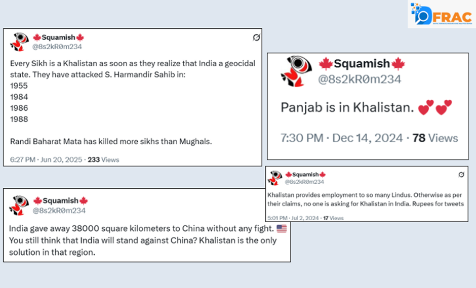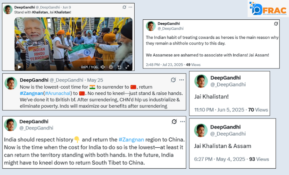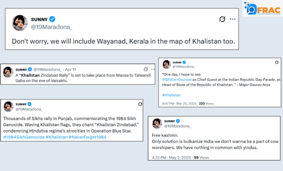 इन्हीं कारणों से यह क्षेत्र हमेशा देश-विरोधी ताकतों के निशाने पर रहे हैं। इसके लिए अलगाववादी प्रोपेगेंडा किया जाता रहा है। डिजिटल प्लेटफ़ॉर्म जैसे फेसबुक, एक्स (पहले ट्विटर), इंस्टाग्राम, टेलीग्राम और यूट्यूब न केवल संवाद के माध्यम हैं, बल्कि इन्हें भ्रामक जानकारी और प्रोपेगेंडा फैलाने के लिए भी बड़े पैमाने पर इस्तेमाल किया जा रहा है। DFRAC की टीम ने हालिया जांच में ऐसा ही एक नेटवर्क उजागर किया है, जो कश्मीर, पंजाब और पूर्वोत्तर को लेकर एक सुनियोजित अलगाववादी अभियान चला रहा है। इनमें से कई अकाउंट्स से की जाने वाली पोस्ट ऐसी होती हैं, जिनसे यह प्रतीत होता था कि ये आवाज़ें सचमुच कश्मीर, पंजाब या पूर्वोत्तर के लोगों की हैं, जो भारत से नाराज हैं और अलगाववादी विचारधारा का समर्थन करते हैं। इसके अलावा कई यूजर्स ऐसे हैं, जो भारत की छवि को खराब करने के इरादे से पोस्ट शेयर करते रहते हैं।