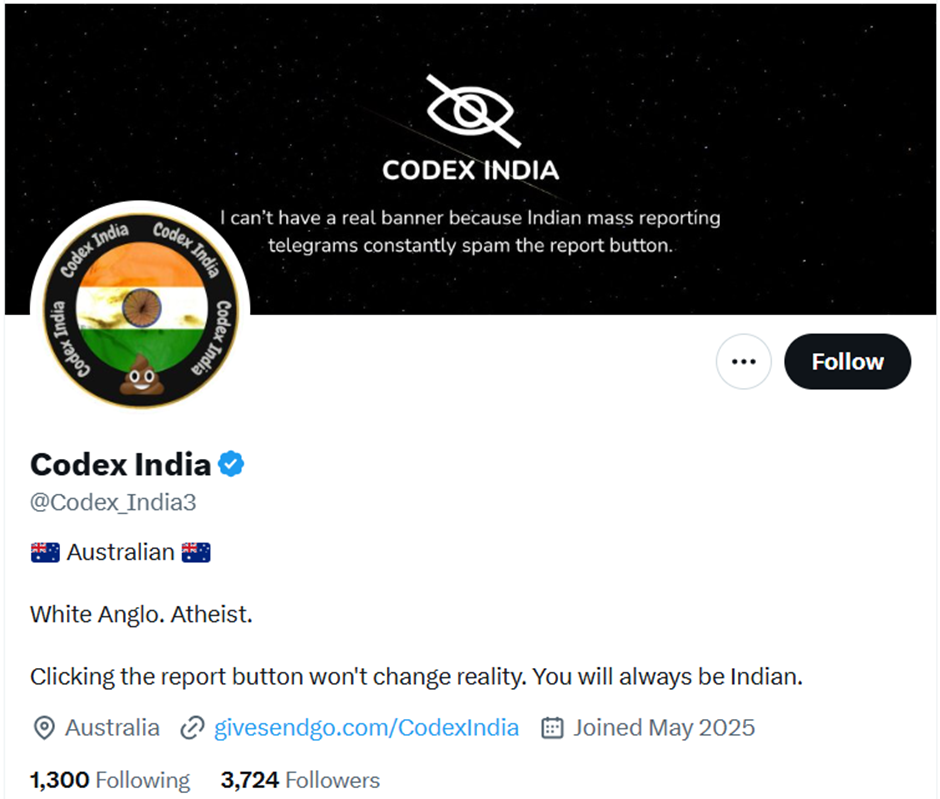 एक्स पर कोडेक्स इंडिया (Codex India) नामक यूजर सक्रिय है। इसकी यूजरआईडी @Codex_India3 है। एक्स पर इसके 3700 से ज्यादा फॉलोवर्स हैं। यह अकाउंट खुद को ऑस्ट्रेलिया से संचालित होने का दावा करता है। हालांकि इसकी ऑनलाइन गतिविधियां इसे संदिग्ध बनाती हैं, क्योंकि यह अकाउंट ना सिर्फ अपनी पहचान को गुप्त रखे हुए है, बल्कि ब्रिटिश प्रसारक, जीवविज्ञानी, प्राकृतिक इतिहासकार और लेखक डेविड एटेनबरो की फेक पहचान भी लिया हुआ है। इसकी पोस्ट भारत की छवि को धूमिक करने के प्रयासों के तहत रहती हैं।