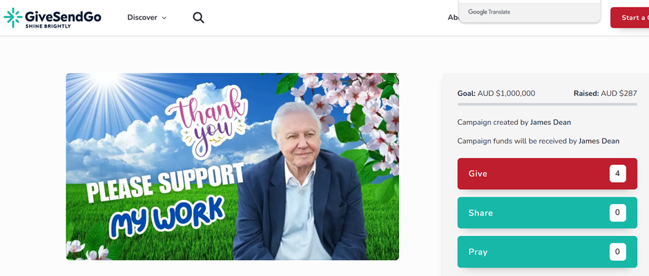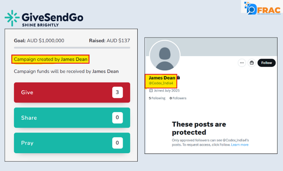 डोनेशन पेज पर लिखा गया लक्ष्य भी हैरान करने वाला है। कोडेक्स इंडिया ने अपने अभियान के लिए 10 लाख ऑस्ट्रेलियन डॉलर (AUD) का लक्ष्य तय किया है, जो भारतीय रुपये में कई करोड़ के बराबर होता है। अब तक की जानकारी के मुताबिक इस लिंक के जरिए 287 ऑस्ट्रेलियन डॉलर जमा भी हो चुके हैं। यह रकम भले अभी कम हो, लेकिन यह बताता है कि कुछ लोग पहले ही इस भ्रामक कैंपेन से प्रभावित होकर पैसे दे चुके हैं। डोनेशन पेज पर एक और अहम जानकारी है — फंडरेज़र बनाने वाले व्यक्ति का नाम जेम्स डीन दिया गया है। वही व्यक्ति इस डोनेशन लिंक को ऑपरेट कर रहा है और डोनेशन के पैसे उसी के खाते में ट्रांसफर हो रहे हैं।