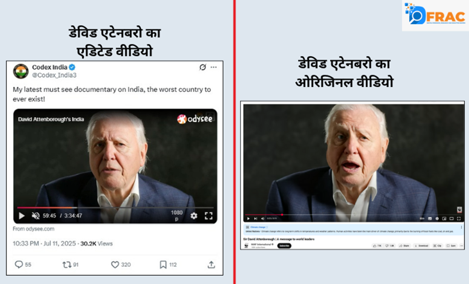 कोडेक्स इंडिया नामक यूजर का अकाउंट देखने में एक सामान्य सोशल मीडिया प्रोफ़ाइल की तरह लगता है, लेकिन गहराई से जांच करने पर यह साफ़ हो जाता है कि यह यूजर बेहद सुनियोजित तरीके से भारत-विरोधी नैरेटिव गढ़ने में लगा है। इसकी सबसे चौंकाने वाली और खतरनाक गतिविधियों में से एक है वह लगभग साढ़े तीन घंटे लंबी ‘डॉक्यूमेंट्री’ जो इस यूजर ने तैयार की है। इस तथाकथित डॉक्यूमेंट्री में डेविड एटेनबरो की फेक वॉयसओवर का इस्तेमाल किया गया है — यानी लोगों को भ्रमित करने के लिए यह दिखाने की कोशिश की गई है जैसे कि मशहूर नेचर डॉक्यूमेंट्री नैरेटर एटेनबरो खुद भारत के बारे में यह बातें कह रहे हों।