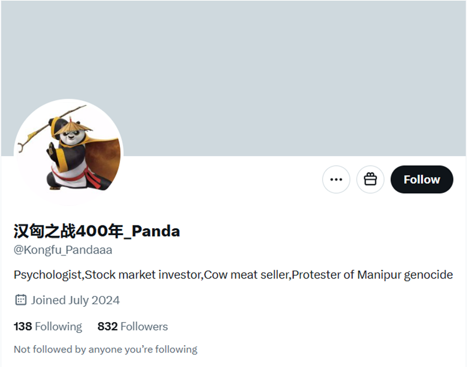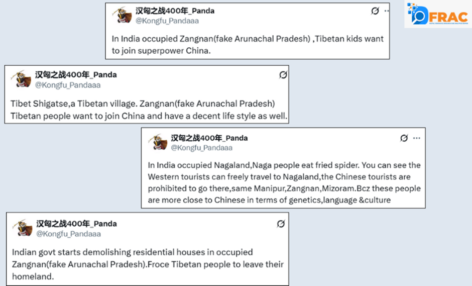 एक सुसंगठित चाइनीज़ प्रोपेगेंडा मशीनरी का हिस्सा है, जो भारत के पूर्वोत्तर राज्यों पर केंद्रित झूठे नैरेटिव गढ़ रहा है। यह हैंडल लगातार अरुणाचल प्रदेश को “जंगनान” कहता है – वही शब्दावली जो चीन की आधिकारिक पॉलिसी और सरकारी मीडिया इस्तेमाल करते हैं। ऐसा कर वह अरुणाचल प्रदेश पर चीन के दावे को वैध दिखाने और भारत की संप्रभुता को चुनौती देने की कोशिश करता है। इसके अलावा, “कुंगफू पांडा” नागालैंड को लेकर “भारतीय कब्जा” जैसी भाषा इस्तेमाल करता है, जो भारत की क्षेत्रीय अखंडता पर सवाल खड़ा करने की सुनियोजित चाल है। यह हैंडल फेक न्यूज़ फैलाने में भी सक्रिय है। अरुणाचल प्रदेश में भारत सरकार द्वारा घर गिराने या लोगों को विस्थापित करने के झूठे दावे बार-बार पोस्ट करता है, जिससे यह दिखाया जा सके कि भारत अपने ही नागरिकों के साथ अन्याय कर रहा है। सबसे चिंताजनक बात यह है कि “कुंगफू पांडा” पूर्वोत्तर राज्यों के लोगों के लिए यह नैरेटिव गढ़ता है कि वे चीन से “सांस्कृतिक और भाषाई तौर पर जुड़े” हैं। इन पोस्टों का पैटर्न साफ़ करता है कि “कुंगफू पांडा” एक लंबे समय तक चलने वाले मनोवैज्ञानिक और सूचनात्मक युद्ध (information warfare) का हिस्सा है।