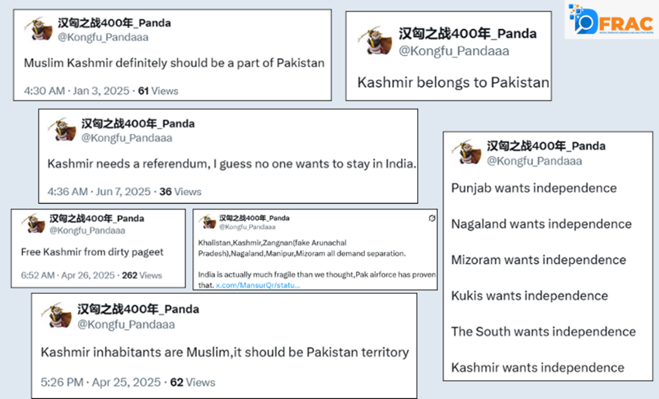कुंगफू पांडा सबसे अधिक कश्मीर और पूर्वोत्तर को लेकर दुष्प्रचार करता है, जहां वह कश्मीर को पाकिस्तान का हिस्सा बताने वाले पोस्ट लिखता है। यह हैंडल केवल कश्मीर तक सीमित नहीं रहता, बल्कि पंजाब को लेकर खालिस्तानी आंदोलन की भाषा अपनाता है और पंजाब के भारत से अलग होने के फेक दावे गढ़ता है। यह हैंडल दक्षिण भारत के राज्यों के बारे में भी भ्रामक दावे करता है, जैसे कि वहां लोग भारत से अलग होने की मांग कर रहे हैं।