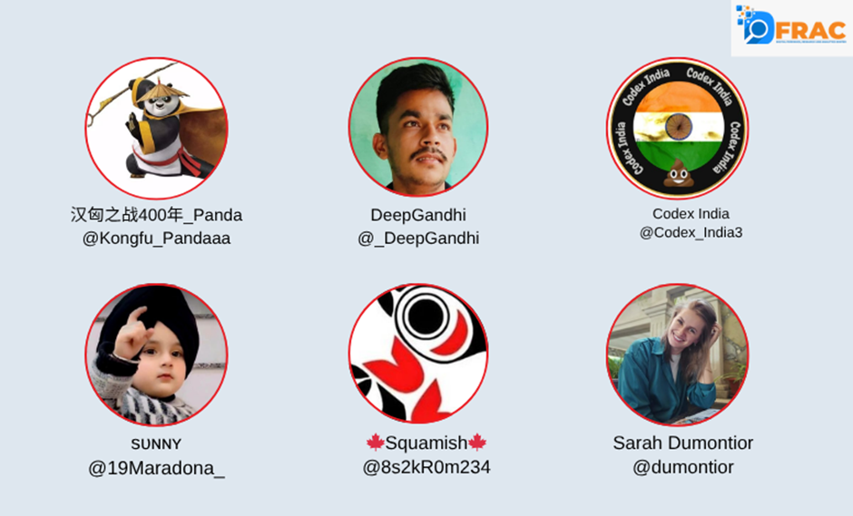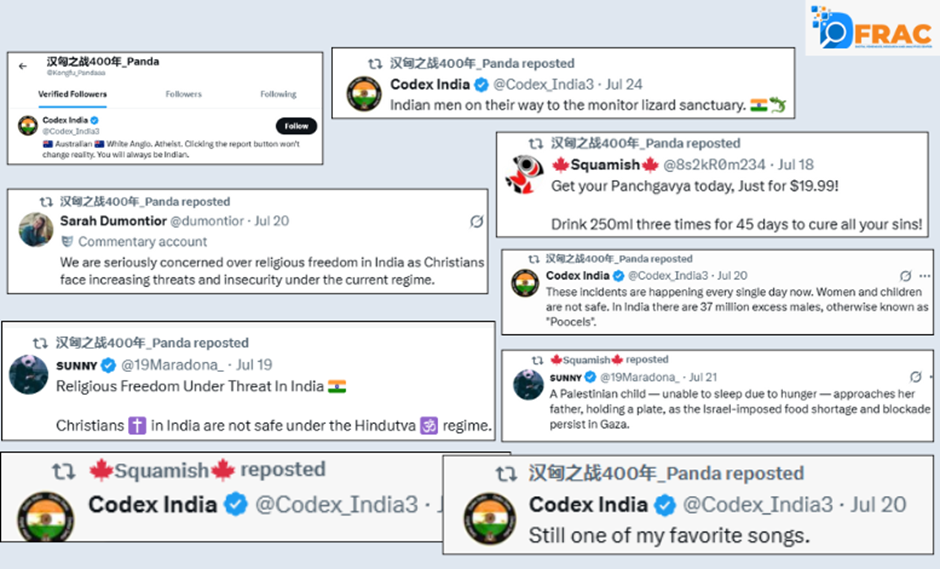 एक्स प्लेटफॉर्म पर सक्रिय कुंगफू पांडा (Kongfu Panda), दीप गांधी (Deep Gandhi), कोडेक्स इंडिया (Codex India), सन्नी (Sunny), स्कैमिश (Squamish) और साराह ड्यूमोनिटर (Sarah Dumonitor) जैसे अकाउंट्स का विश्लेषण बताता है कि ये अलग-अलग नामों से काम करते हुए भी एक समन्वित डिजिटल नेटवर्क की तरह सक्रिय हैं। इन अकाउंट्स के बीच लगातार इंटरैक्शन, एक-दूसरे की पोस्ट का रिपोस्ट और कोट ट्वीट करना, और एक ही नैरेटिव को बार-बार दोहराना दिखाता है कि यह महज़ संयोग नहीं, बल्कि एक सोची-समझी रणनीति का हिस्सा है।