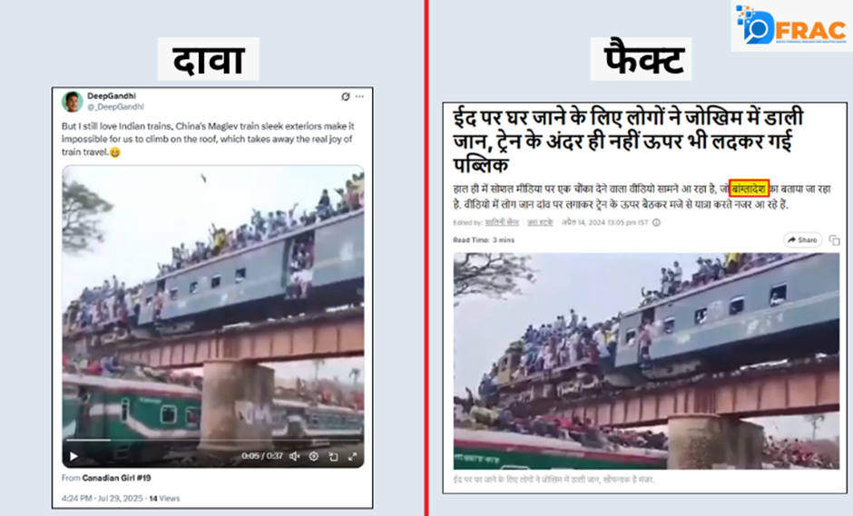 दीप गांधी द्वारा भारत का बताते हुए एक वीडियो शेयर किया है, जिसमें देखा जा सकता है कि एक ब्रिज के ऊपर और नीचे दो ट्रेनें गुजर रही हैं। दोनों ट्रेन के ऊपर बड़ी संख्या में लोग बैठे हुए दिखाई दे रहे है। DFRAC की टीम ने फैक्ट चेक में पाया कि वायरल वीडियो भारत का नहीं, बल्कि बांग्लादेश का है।