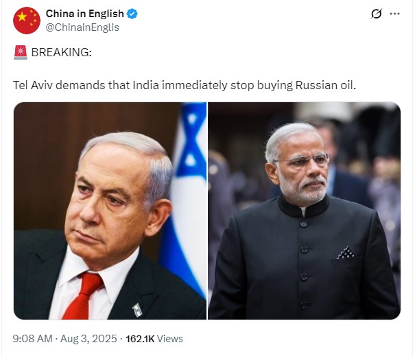 सोशल साईट X पर वेरिफाइड यूजर चाइना इन इंग्लिश ने लिखा कि “ब्रेकिंग – तेल अवीव ने भारत से रूसी तेल खरीदना तुरंत बंद करने की मांग की”