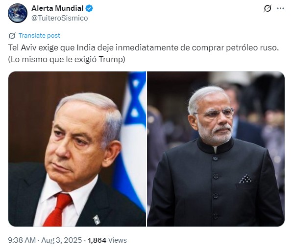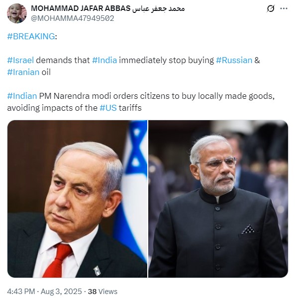 वहीं एक अन्य यूजर ने लिखा कि #ब्रेकिंग: #इज़राइल की मांग है कि #भारत तुरंत #रूसी और #ईरानी तेल ख़रीदना बंद करे #भारतीय प्रधानमंत्री नरेंद्र मोदी ने नागरिकों को #अमेरिकी टैरिफ़ के प्रभाव से बचने के लिए स्थानीय स्तर पर बने सामान ख़रीदने का आदेश दिया है