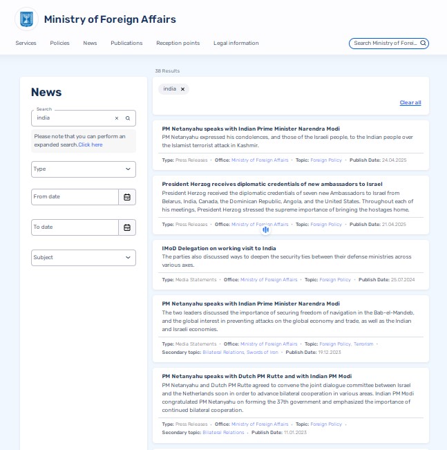 जांच को आगे बढ़ाते हुए हमने इजरायल के विदेश मंत्रालय की वेबसाईट की भी जांच की। लेकिन वहां पर हमें इस बारे में कोई जानकारी नहीं मिली।